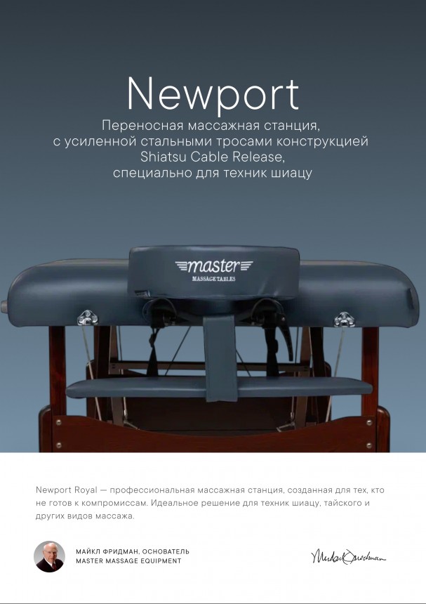 Массажный стол Master Massage Newport прост в установке и регулировке по высоте: ножки с автофиксацией (Auto-Lock), петли Duo-Plane, стабилизирующая перекладина и прочные крепления ножек Clevis Block обеспечивают повышенную надёжность.