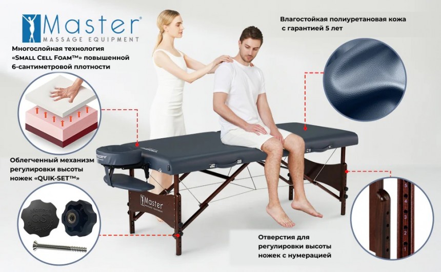 Благодаря конструкции "Big Top" и матрасу толщиной 6,5 см из уникального многослойного пеноматериала Multi-Layer Small Cell™ Foam, стол дарит максимальное удобство. Прямоугольные углы способствуют лучшему расслаблению плечевой зоны. Обивка цвета королевский синий устойчива к маслам и воде, не содержит вредных CFC, что гарантирует долговечность и безопасность этого профессионального оборудования.