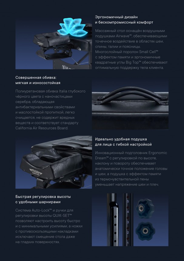 Особенно нравится функция AirWave — воздушные подушки мягко растягивают и скручивают тело, создавая ощущение полного расслабления, снимают напряжение и повышают гибкость. В целом стол полностью оправдывает свою цену и рекомендую его всем, кто ищет качественный и функциональный массажный стол.