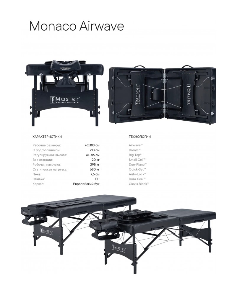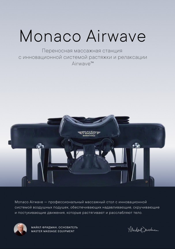 Monaco AirWave — это инновационный массажный стол с функцией массажа всего тела с помощью воздушных подушек, который сочетает в себе комфорт, функциональность и технологичность. Специальная система AirWave мягко растягивает и скручивает тело клиента за счёт сжатия и расслабления воздушных камер, помогая снять напряжение, повысить гибкость и обеспечить глубокое расслабление.