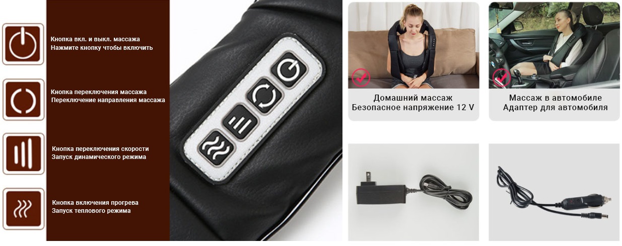 Массажер подключается в розетку или автомобильный прикуриватель с помощью адаптеров из комплекта.