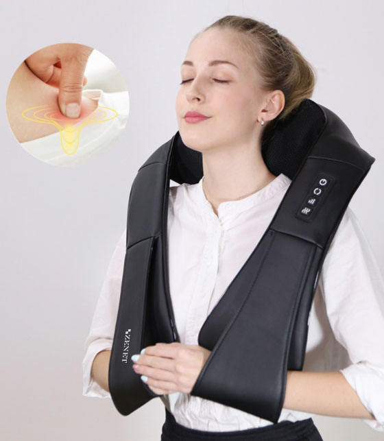 Массажер сделан в виде накидки на плечи и имеет анатомическую форму – повторяет контуры тела.